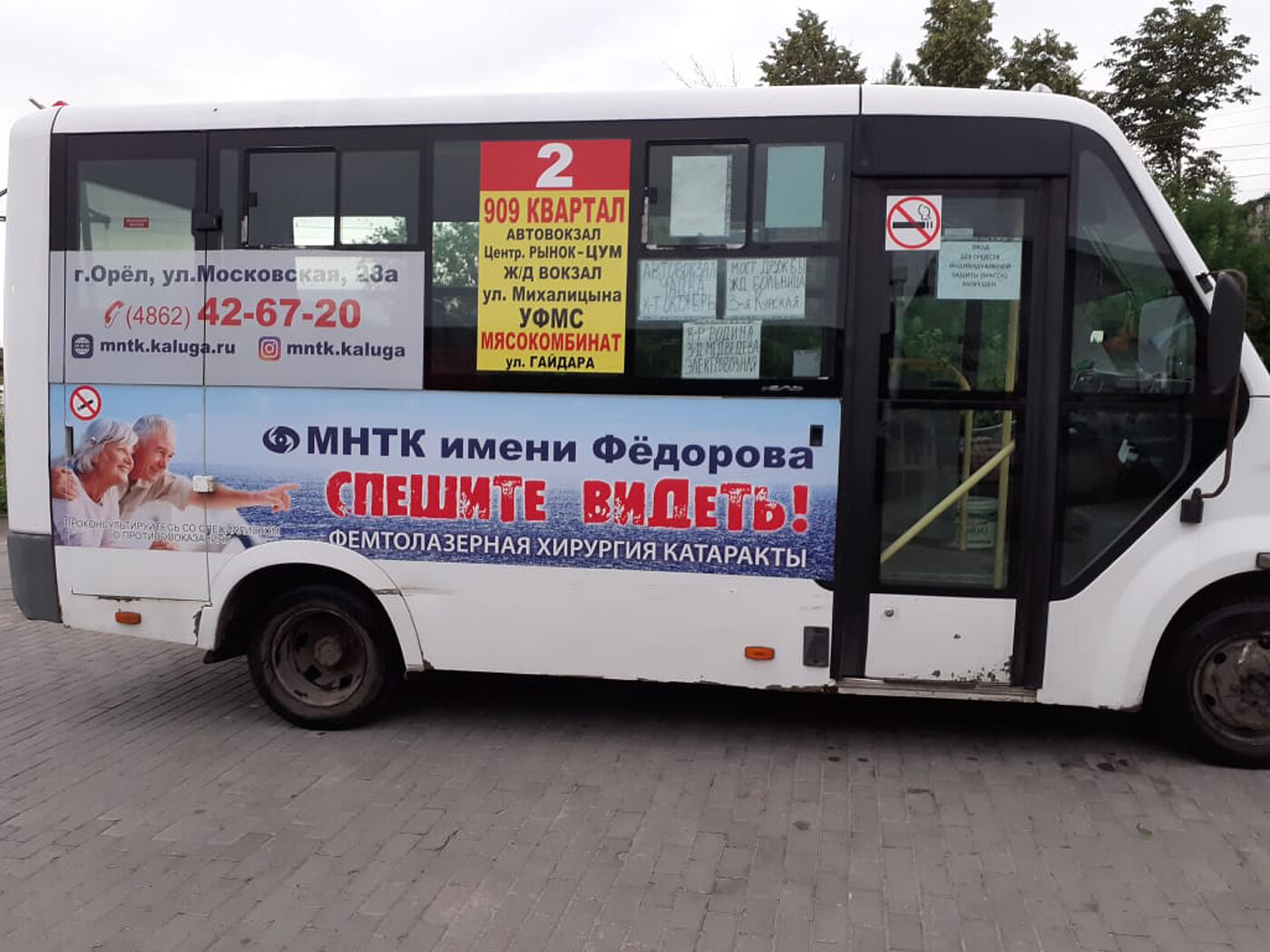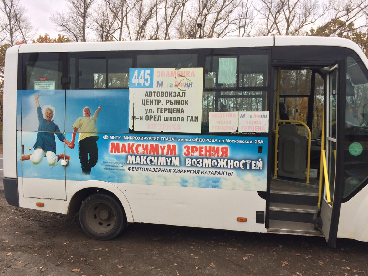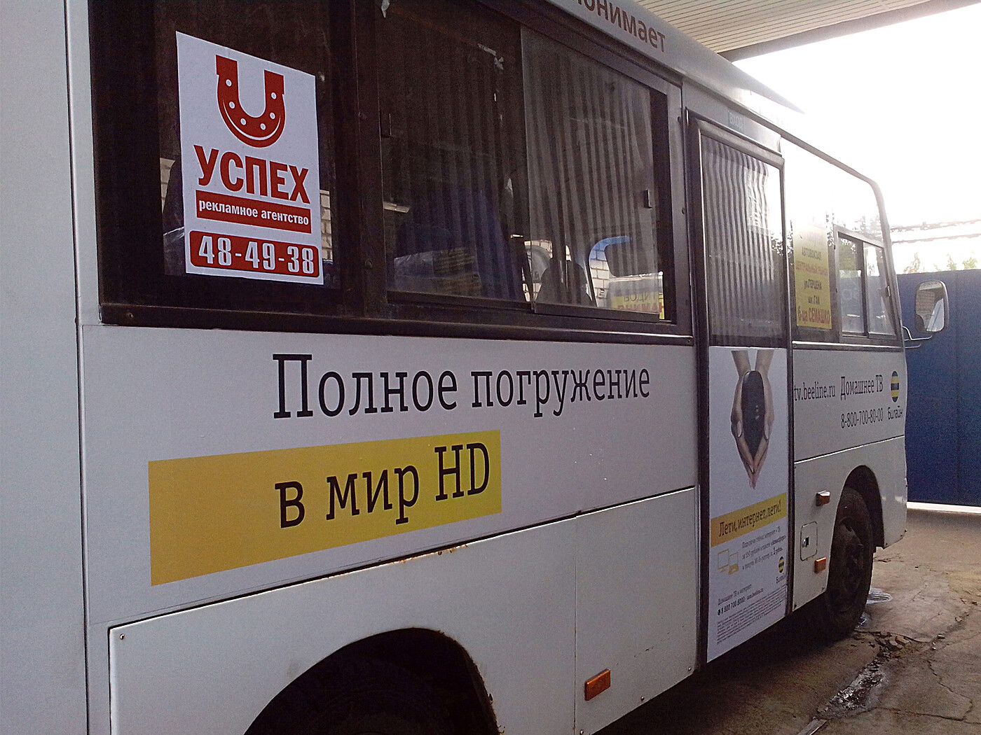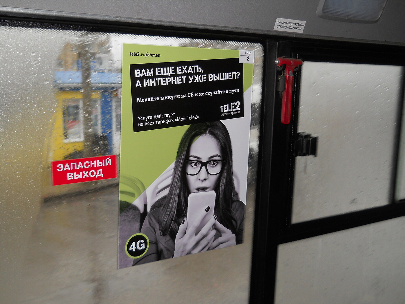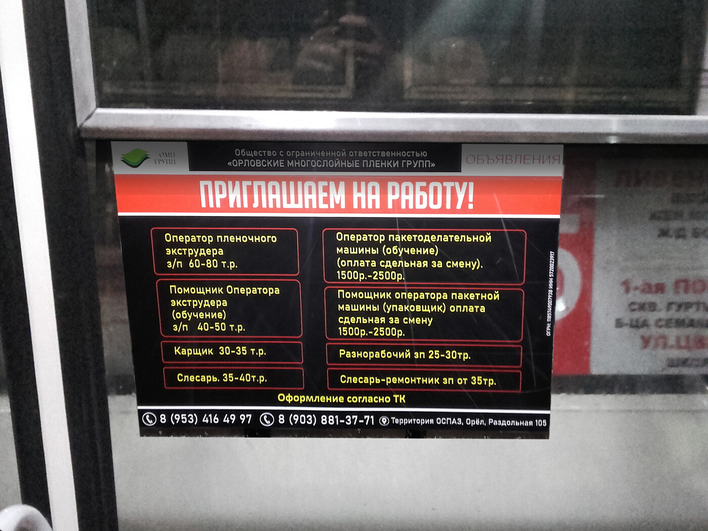 Реклама размещается на окнах, в салоне маршруток, трамваев, троллейбусов, изображением внутрь. Минимальный срок размещения 1 месяц. Минимальный объем размещения - 50 стикеров (листовок)