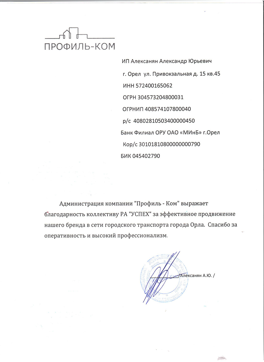 Сотрудничаем с РА "Успех уже длительный период и очень довольны!