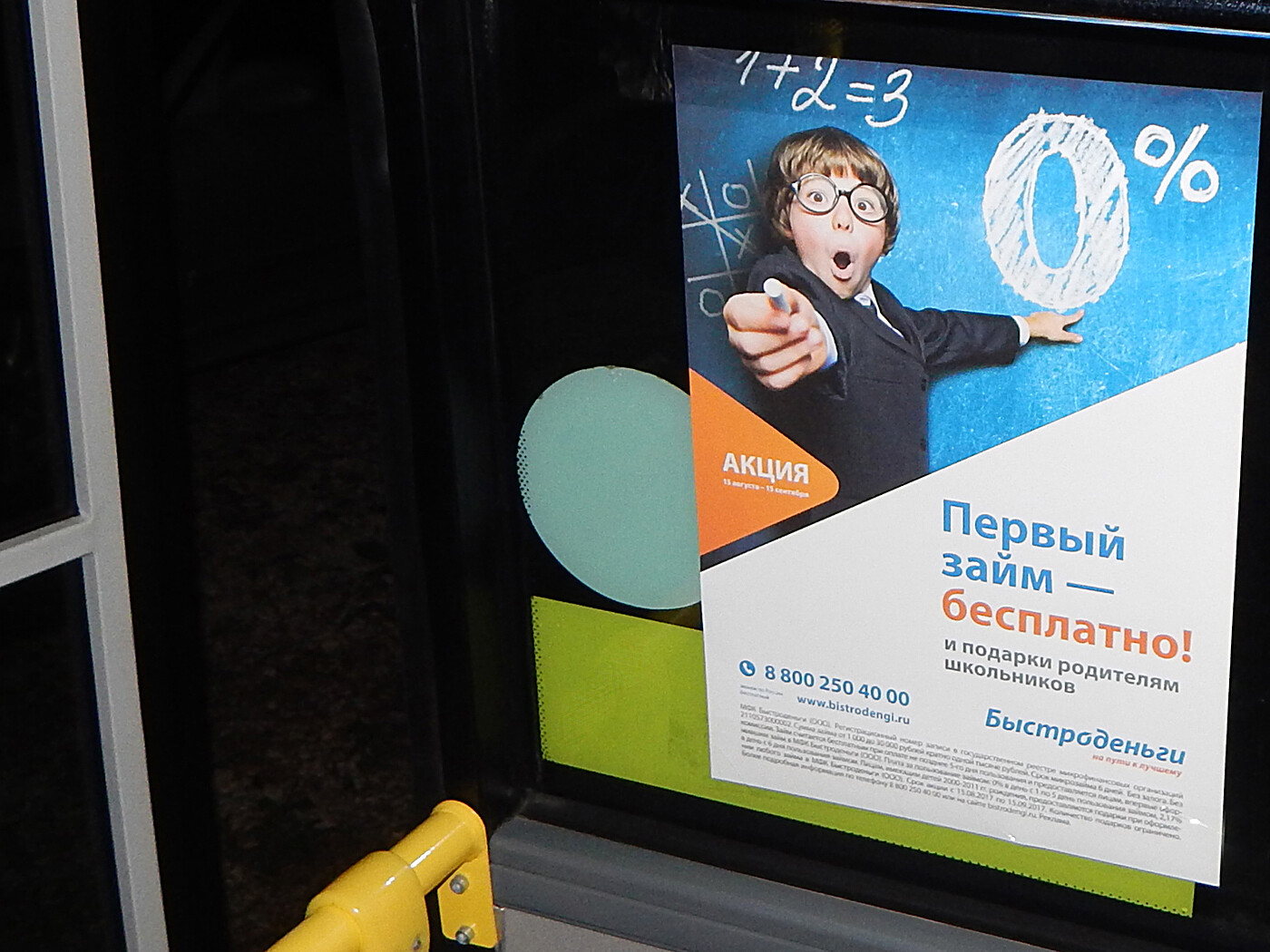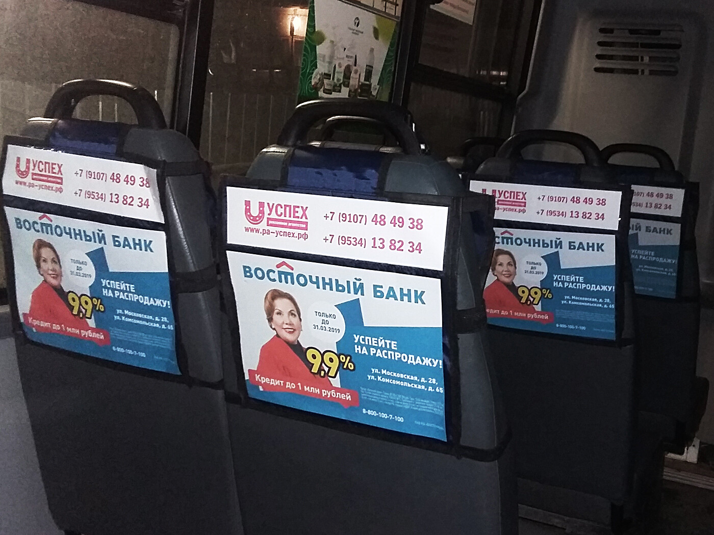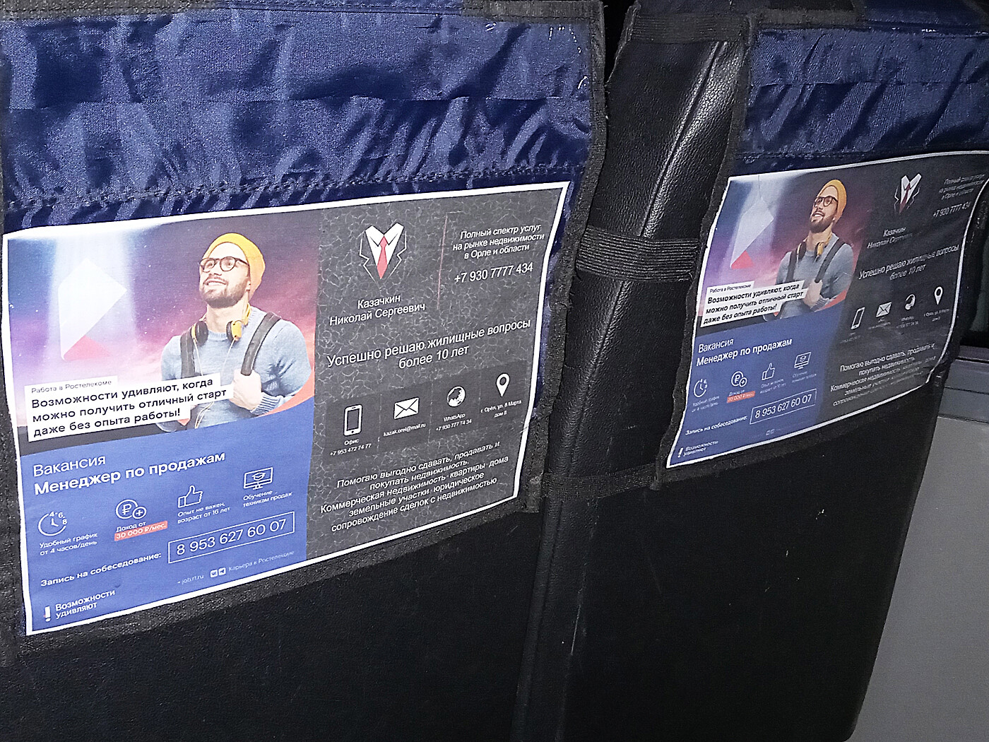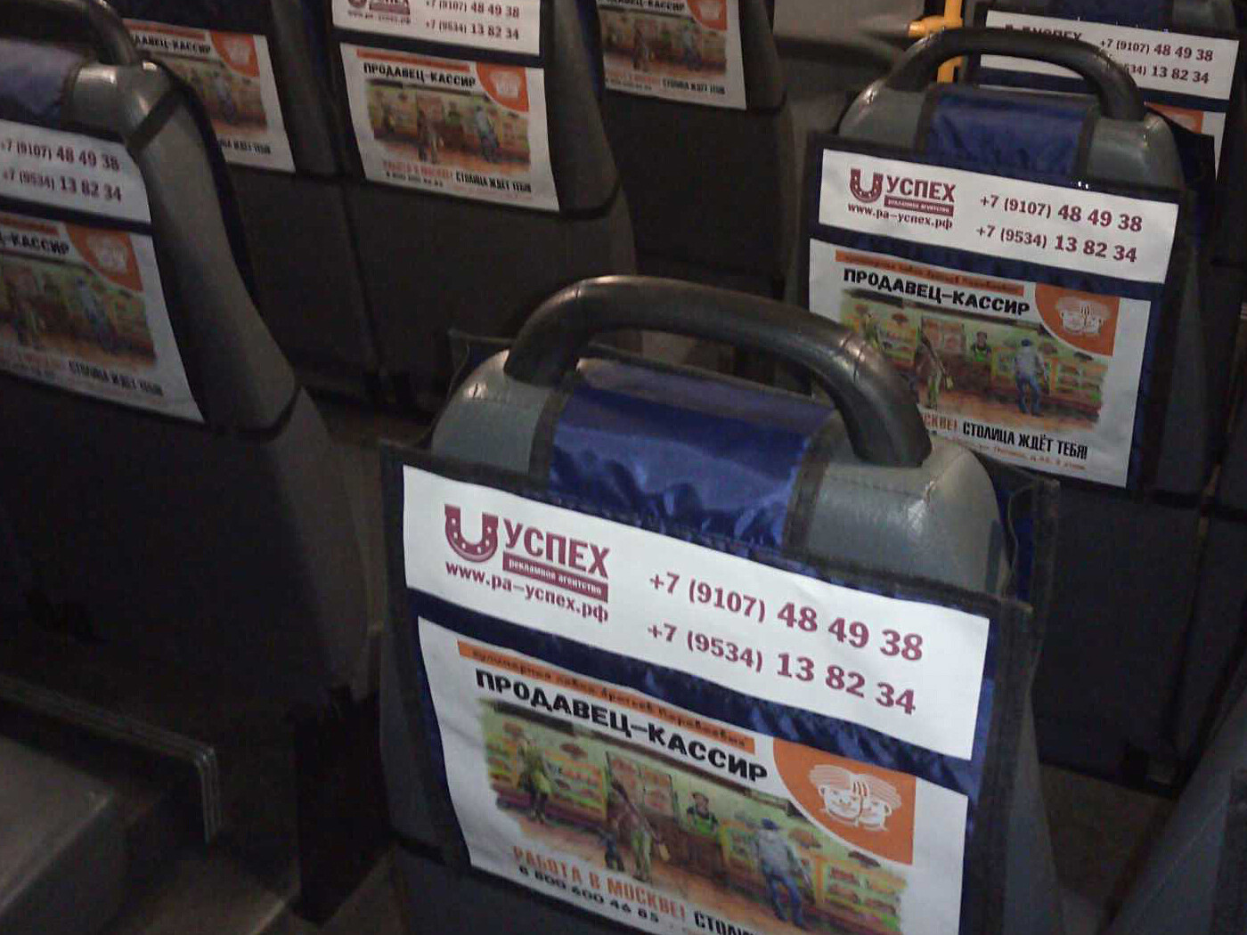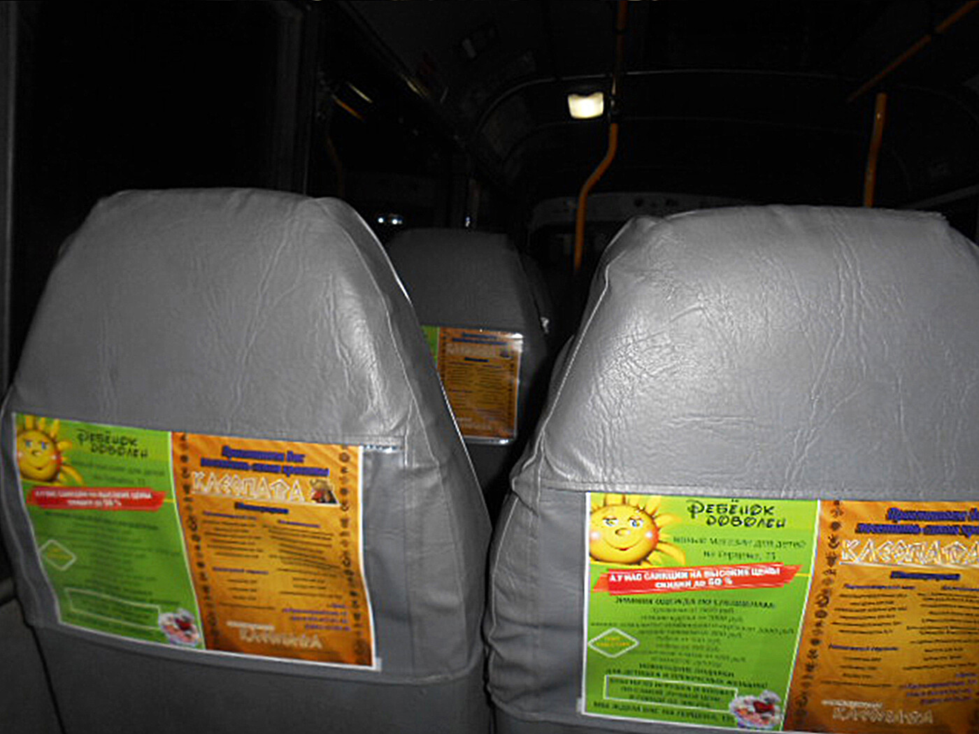 Реклама размещается в салоне маршрутки на задней части спинки каждого сиденья. То есть в салоне одного автобуса размещается 14 и более (в зависимости от марки автобуса) стикеров с ваше рекламой. Формат стикера А5 или А4. Минимальный срок размещения 1 месяц.
