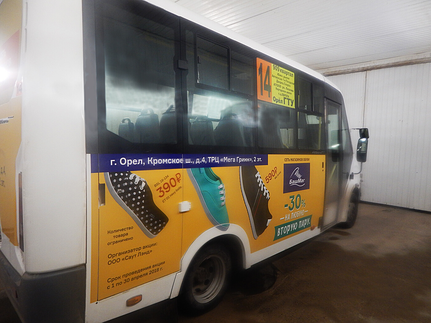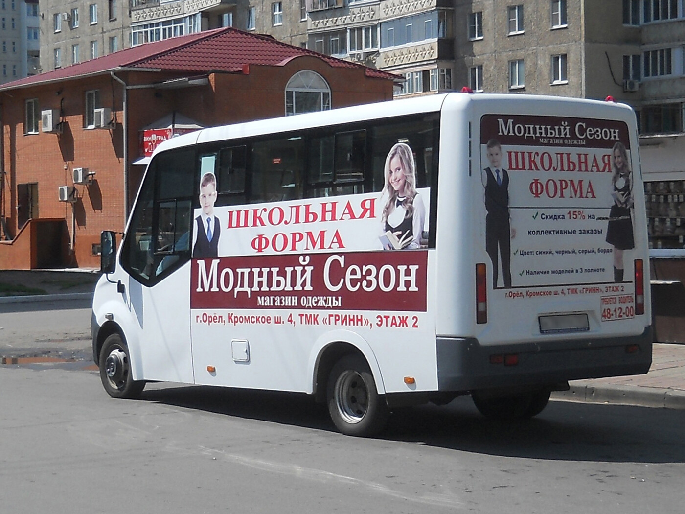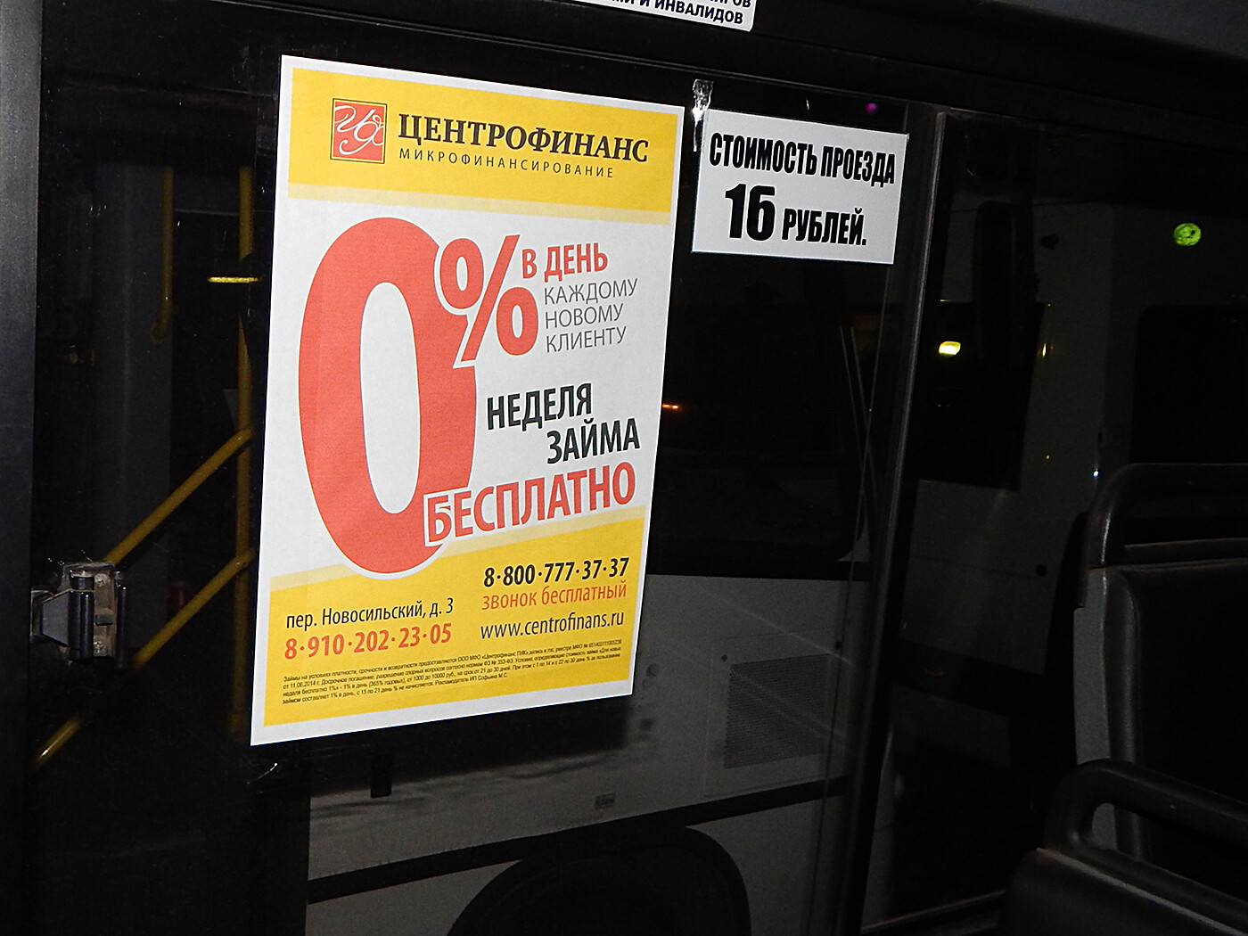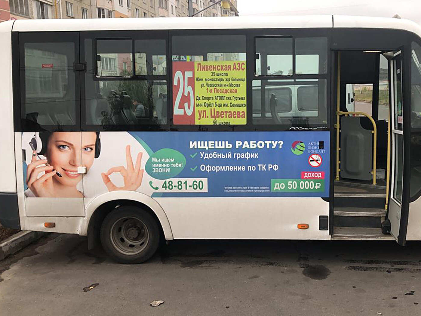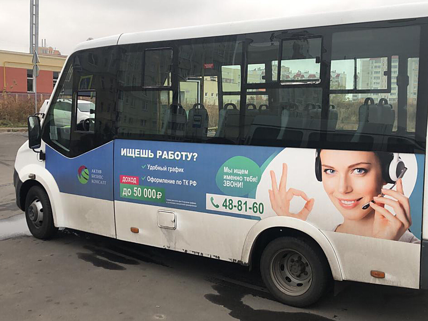 Реклама размещается в салоне маршрутки на задней части спинки каждого сиденья. То есть в салоне одного автобуса размещается 14 и более (в зависимости от марки автобуса) стикеров с ваше рекламой. Формат стикера А5 или А4. Минимальный срок размещения 1 месяц.