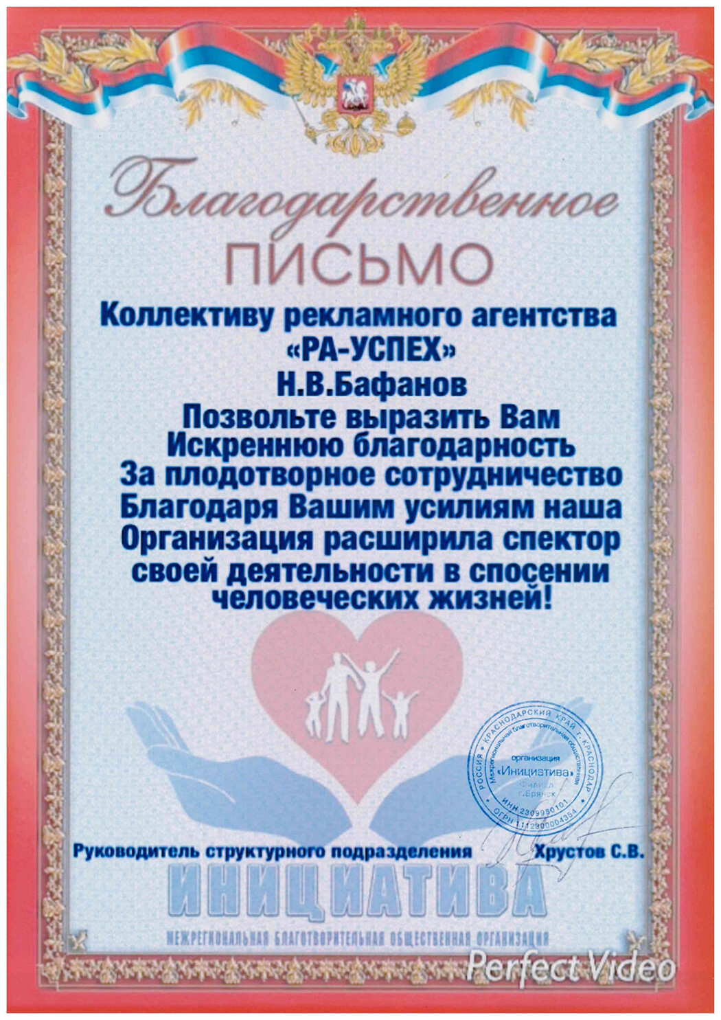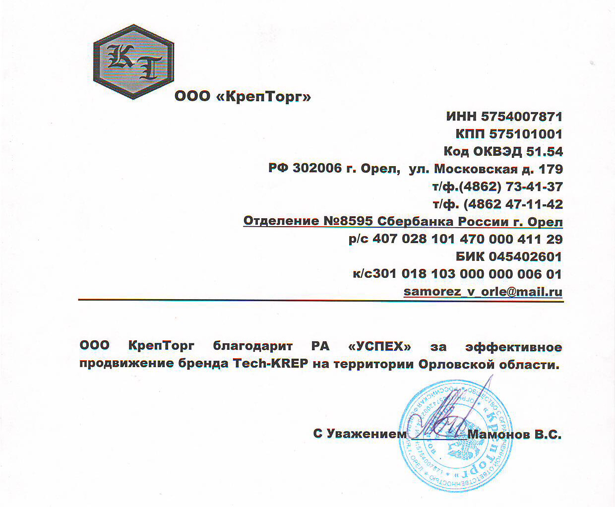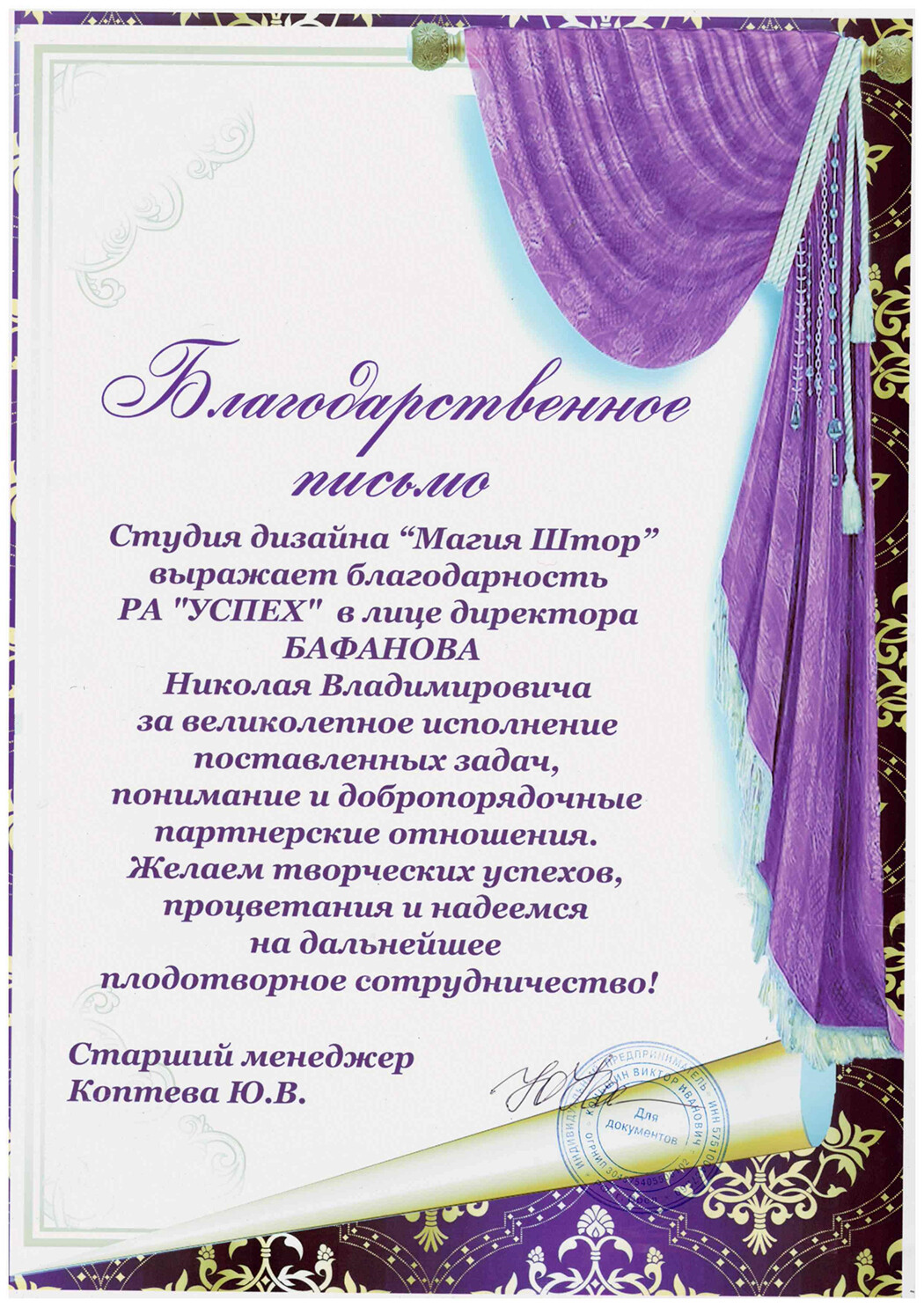 Сотрудничаем с РА "Успех уже длительный период и очень довольны! Всегда делают работу в указанные сроки! Никуда ездить не надо, работать с ними очень легко и приятно. Спасибо!