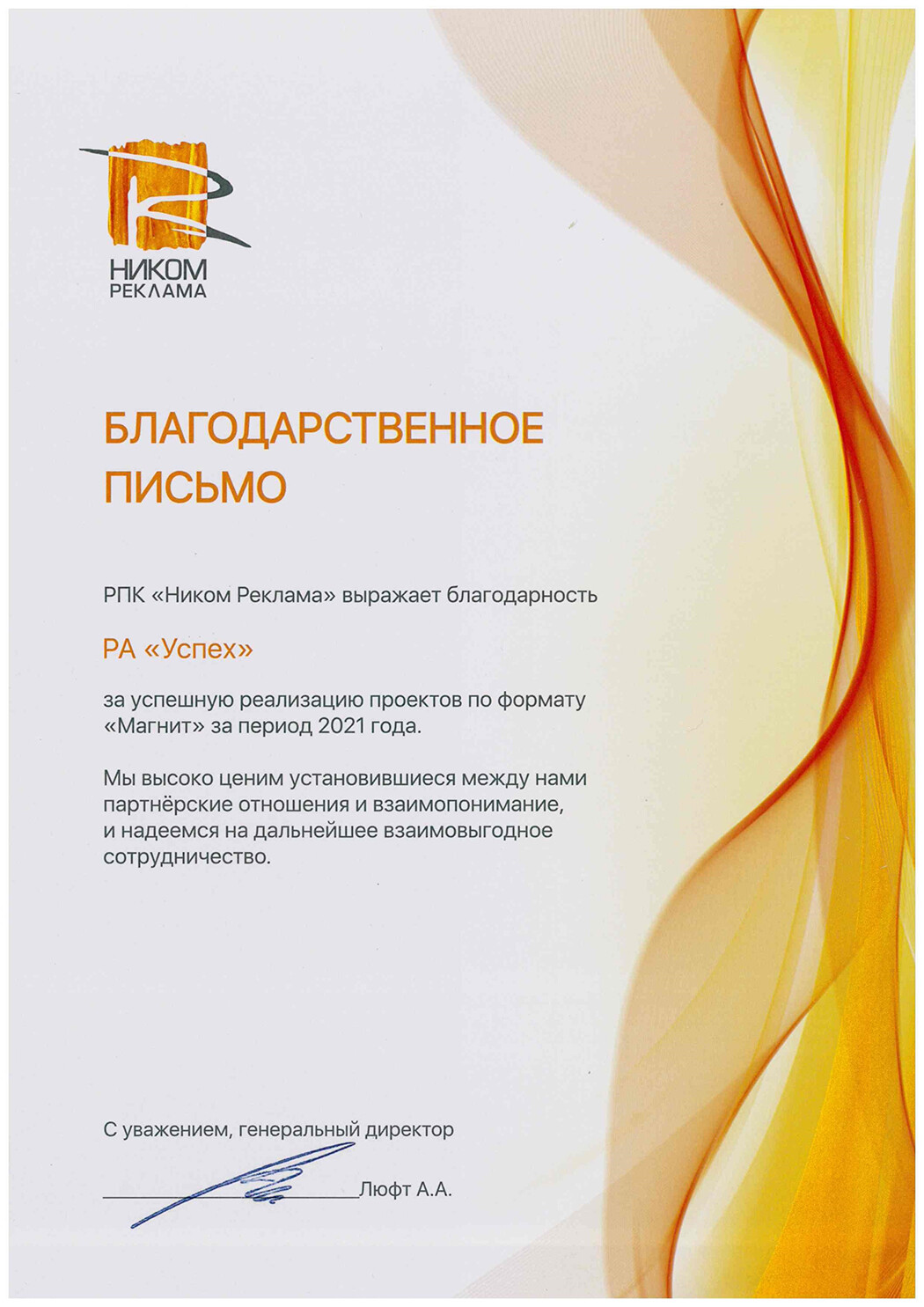 Мы сотрудничаем с рекламным агентством "Успех" уже порядка 3-х лет. Благодаря их профессионализму, оперативности и высокому качеству предоставляемых услуг мы смогли решить множество целей и задач. Уверены, что в будущем мы будем продолжать работать в таком же ключе!